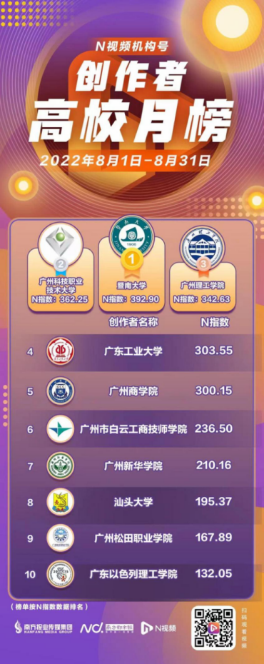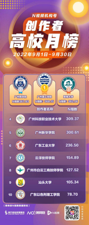 On October 10, N-Videos announced the TOP monthly list of creators in September, Guangzhou Institute of Science and Technology(GZIST) topped the monthly list of Guangdong universities.