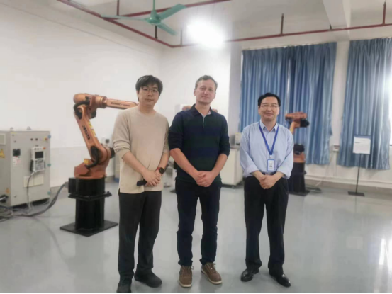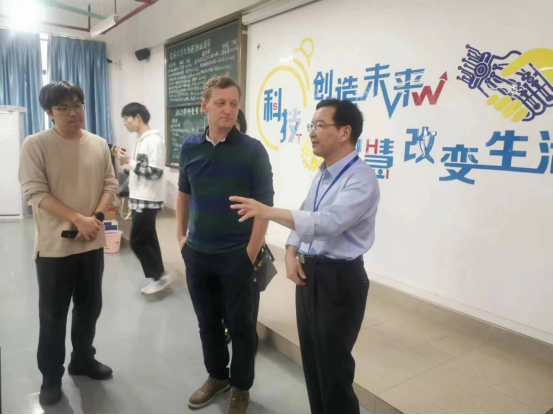 随后,智电学院汪理老师在工程中心向鲁道夫教授一行介绍了我校学生在全国机器人大赛获得一等奖的作品,播放了学生比赛的视频。鲁道夫教授对我校学生以小组为单位进行课题研究和成果论文出版并传给下一年级的同学这个好传统表示赞赏。