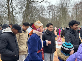 除了课上的学习,学校偶尔也会举行集体活动让大家更加直观的感受俄罗斯的文化。让我印象深刻的便是俄罗斯春天的传统节日谢肉节。人们举办谢肉节,想借各种狂欢活动驱散寒冬,迎接温暖与希望,祈祷新的一年风调雨顺。即便在零下十度的寒冷中,我也跟着人群在叶拉金岛跳火堆,看着俄罗斯小哥把薄饼抛向半空,俄语老师拉着我们往火焰里扔写满愿望的布条,伴随着将象征冬天的稻草人一起烧掉,共同迎接春天的到来。