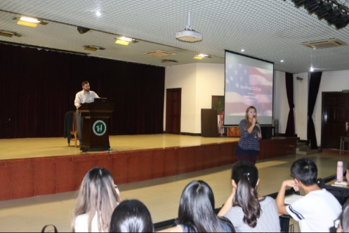 Ashley Hurst博士从美国的地理位置、人文环境、饮食气候、各地语言特色等方面进行阐述,让同学们对美国的生活与文化有了总体的了解。Ashley博士的讲座生动活泼,六栋报告大厅座无虚席,同学们听得聚精会神。演讲结束后,同学们踊跃提问,现场气氛活跃。不少同学在讲座结束后与Ashley博士互留联系方式,合影留念。