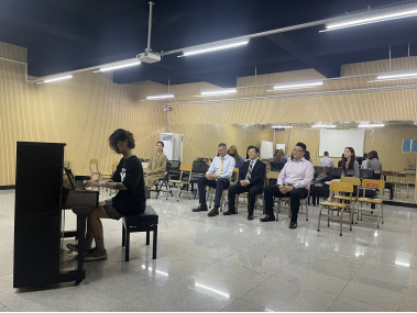 随后,柯林斯博士、凌雄辉主任在梁学宏院长的陪同下参观了音乐舞蹈学院,与丁义院长、李丽丹副院长、张隆隆老师等进行了交流,并观摩了声乐课、钢琴课和民乐演奏。美国哈丁大学有很好的音乐硕士和教育学硕士课程,对我校音乐表演、声乐方向、器乐方向和舞蹈表演专业学生来说是读研深造的好地方。